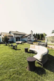 Farmhouse tables, wooden chairs, Adirondack seating, and barrel cocktail tables